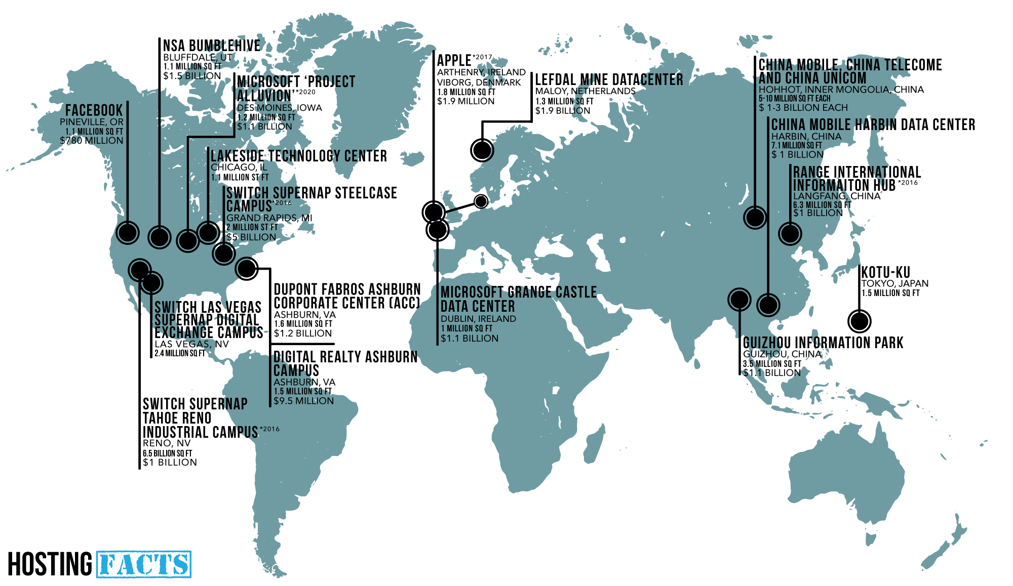 Here, we map out some of the biggest data centers, current and upcoming, around the world. Now, data centers can be hard to compare, as some are essentially just buildings full of servers, while others include office, convention, and sometimes even living space. Plus, new projects are announced every few months, each seemingly bigger and better than the last. Nevertheless, we think the map gives a pretty good idea of the world’s hosting hot spots and just how much is being invested in creating them.
